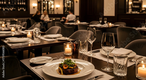 eatery, fine dining, epicure, food, meal, dinner, steak, beef, dish, plate, table setting, candle, candlelight, romantic, elegant, luxury, interior, wine glass, crystal glass, cutlery, fork, knife, napkin, people, background, blurred background, atmosphere, evening, garnish, sauce, delicious, served, cookery, gourmet food, celebration, hospitality, service, chair, furniture, warm light, lamp, bokeh, sophisticated, classic, expensive, establishment