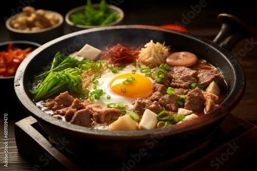 An Exquisite Sukiyaki Meal Cooked in a Classic Japanese Style, Featuring Beef and Tofu in a Savory Broth