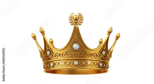 An exquisitely detailed golden crown adorned with brilliant diamonds on a clean white background, a digital rendering symbolizing royalty, luxury, and success