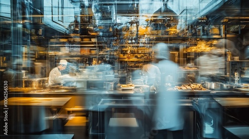 An extended shot of a busy kitchen filled with chefs busy preparing food, displaying a motion blur of their movements