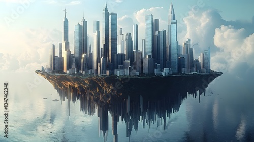 an extraordinary floating city surrounded by fluffy clouds and a mirror-like reflection beneath it, creating a surreal and futuristic atmosphere