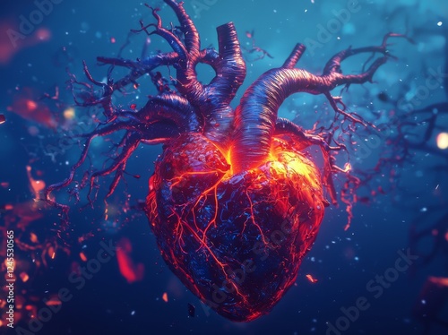 An illuminated 3D representation of the human heart exhibiting left ventricular hypertrophy, a condition where the left ventricle becomes thicker, obstructing blood flow and oxygen distribution
