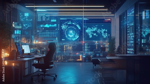 computer, screen, monitor, datum, display, information, technology, office, window, interior, desk, chair, workspace, futuristic, digital, light, building, city, software, coding, analysis, network, server, security, control, panel, chart, graph, graphic, business, research, communication, observation, system, processing, virtual, interface, console, layout, view, structure, architecture, design, modern, dark, visualisation, illumination
