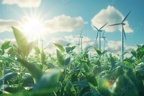 An illustration depicting green energy solutions, highlighting the transition to renewable energy sources such as wind turbines, solar panels, and hydroelectric power. The scene emphasizes sustainabil