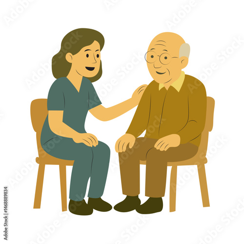 caregiver, elderly, senior, man, woman, support, comfort, gentle, care, nursing, health care, compassion, empathy, kindness, assistance, illustration, sitting, chair, conversation, hand, shoulder, peaceful, connection, home, facility, medicals, help