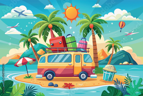 beach, van, mountain, sun, palm tree, surfboard, flip-flop, palm, sea, summer, tree, island, tropical, sand, water, ocean, travel, vector, illustration, landscape, nature, sky, vacation, holiday, paradise, wave, sunset, coconut, coast, hot
