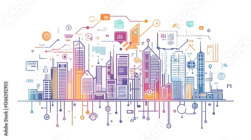an illustration of a modern smart city skyline, showcasing interconnected technology and urban infrastructure