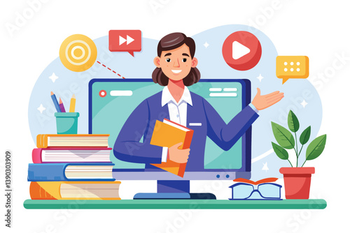 teacher, online, lesson, learning, computer, screen, female, smile, book, education, digital, classroom, student, virtual, technology, cognition, teaches, present, lecture, study, school, tutorial, distance, remote, teaching, instructor, platform, interactive, course, tutor