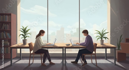An illustration of two people working on laptops at a large table by the window in a bright, modern library.