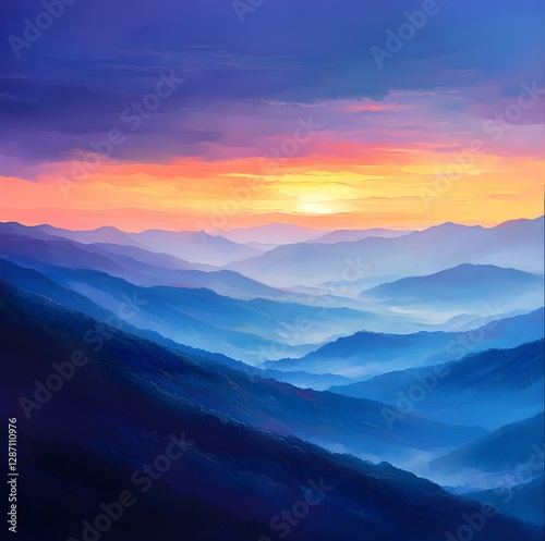 An illustration style depiction of a breathtaking sunset over the Blue Ridge Mountains, with vibrant colors painting the sky and mist rolling through valley after valley.