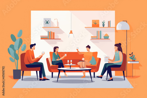 An ilration of a family in a living room discussing how to respond to violence in their neighborhood. Psychology art concept. AI generation