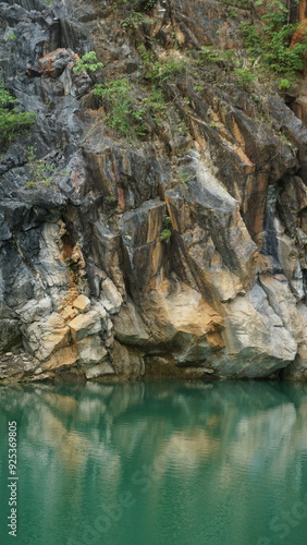An image of a rocky cliff with a mix of gray and reddish hues, surrounded by greenery.
