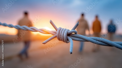 An image of barbed wire and migrants represents the issues and consequences of refugee and immigration policies. The problems caused by war and international political conflicts.