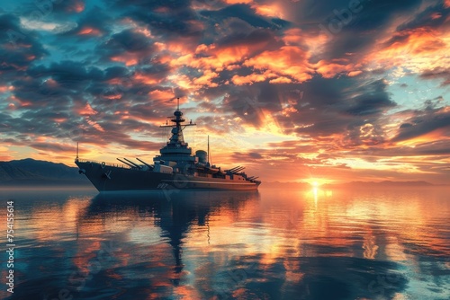 An imposing navy battleship at anchor in a secluded bay, with the sun setting directly behind it, creating a dramatic silhouette.