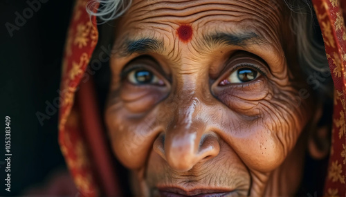 An indian elderly woman with deep wrinkles and wise eyes is shown in close-up with gentle natural lighting.
