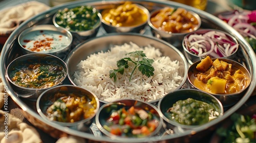 An Indian thali featuring a selection of curries, rice, and condiments, representing the diversity of Indian cuisine.