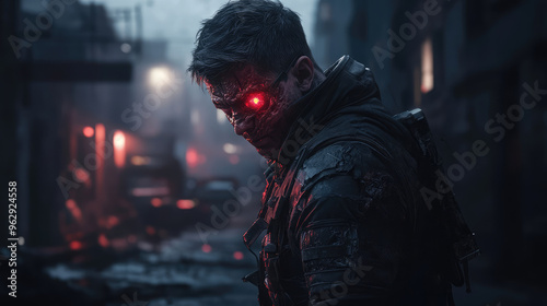 An infected man with red eyes and a black jacket stands in a dark alley
