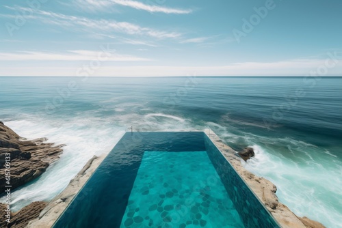 infinity pool, ocean, clear sky, sea, tropical, beach, horizon, water, luxury, travel, vacation, resort, blue, paradise, tranquil, idylli, leisure, relaxation, clearwater, panoramic view, calm, peaceful, scenic, exotic, outdoors, summer, freedom, generative, ai, illustration