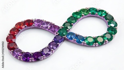 An infinity symbol made entirely of polished gemstones, including amethyst, emerald, sapphire, and ruby.