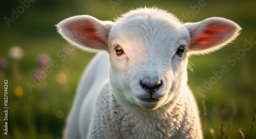 lamb, sheep, animal, baby, young, cute, adorable, innocent, gentle, sweet, fluffy, soft, wool, fleece, white, farm, farming, agriculture, farm animal, husbandry, rural, countryside, pasture, meadow, field, grass, green, nature, outdoors, spring, summer, sunny, sunlight, sun, light, bright, warm, day, portrait, closeup, face, head, eye, ear, nose, looking, staring, calm, peaceful
