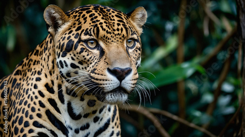 An intense close-up of a leopard, highlighting its striking rosette-patterned coat and piercing gaze