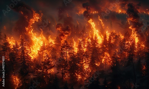 An intense forest fire is blazing through trees, creating a dramatic and destructive scene with thick smoke and glowing embers.