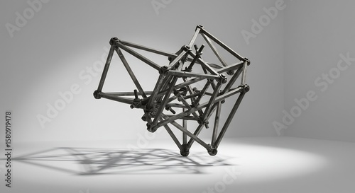 metal, structure, sculpture, geometric, abstract, industrial, art, object, frame, dark, grey, light, shadow, room, corner, floor, bright, studio, complex, intricate, design, engineering, construction, truss, angular, rigid, bolted, joint, bar, beam, modern, minimalist, form, shape, three-dimensional, space, pattern, network, framework, metallic, interior, clean, stark, monochrome, still, life, artistic