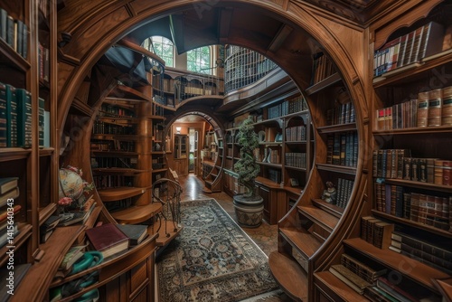 library, bookshelf, book, labyrinth, labyrinth, arched, circular, wooden, antique, vintage, old, classic, literature, reading, cognition, history, research, fantasy, fiction, globe, plant, carpet, interior, design, architecture, hidden, secret, mysterious, magical, enchanting, captivating, mesmerizing, stunning, beautiful, elegant, ornate, grand, traditional, historic