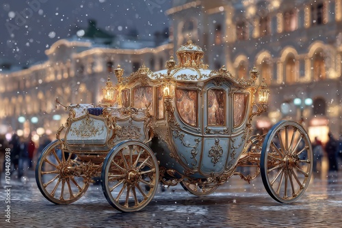 An intricately designed, opulent royal carriage stands in a snowy cityscape, adorned with gold and delicate detailing, creating a fairytale atmosphere under soft lights.