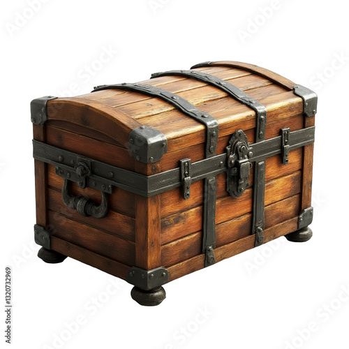 An intricately designed wooden treasure chest with metal fittings, showcasing craftsmanship and vintage aesthetics, perfect for storage or decorative purposes.