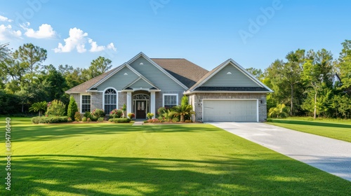 An inviting image of a suburban single-family house with a large green lawn and a welcoming tree-lined driveway