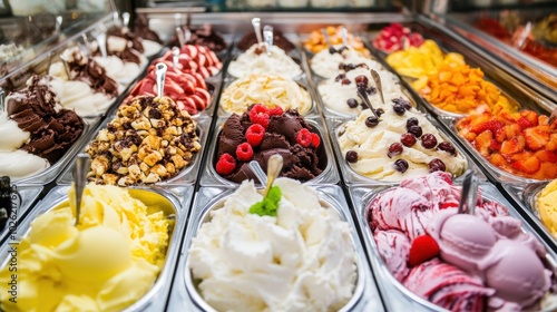 An inviting shot of a colorful gelato display showcasing numerous flavors and toppings, making it look delicious and appealing against a bright backdrop.