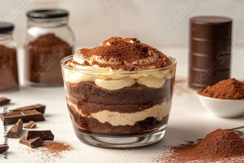 An Italian classic dessert-Tiramisu in glasses topped with savoyardi cookies, mascarpone, cream liqueur and cocoa powder. Closeup.
