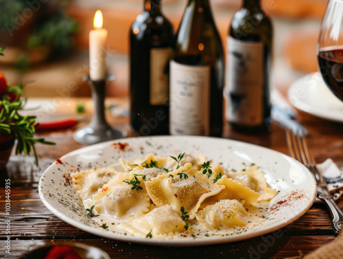 ravioli, hand-made, creamy, sauce, vintage, wine, bottle, rustic, decor, italian, cookery, dining, table, fork, epicure, pasta, culinary, comfort, food, heritage, tradition, intimate, ambience, fresh, ingredient, artisanal, life events, favor, indulgence, savoury, dish, romantic, meal, gastronomy, plating, eatery, delicacy, receipe, presentation, local, chef, seasonal, culture, authenticity, banquet, gathering, enjoyment, hospitality