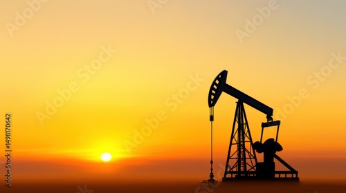 An oil pump jack stands against a vibrant sunset, silhouetted against the horizon. The sun casts warm colors across the sky, highlighting the energy production process in a serene setting