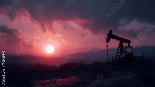 oil, sunset, landscape, industry, energy, production, dusk, rig, extraction, equipment, technology, automation, mechanical, silhouette, sunrise, dawn, twilight, sky, cloud, atmosphere, desert, arid, barren, desolate, natural, environment, resource, power, fuel, economy, business, work, labor, engineering, vintage, retro, dark, dramatic, moody, pink, red, orange, light, glow, horizon, earth, ground, dirt, rural