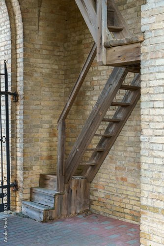 An old antique wooden staircase. An external staircase for the entrance to the bell tower of the old church.