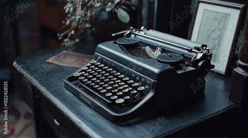 An old black typewriter sitting on a black wooden desk, evoking a vintage, noir aesthetic.