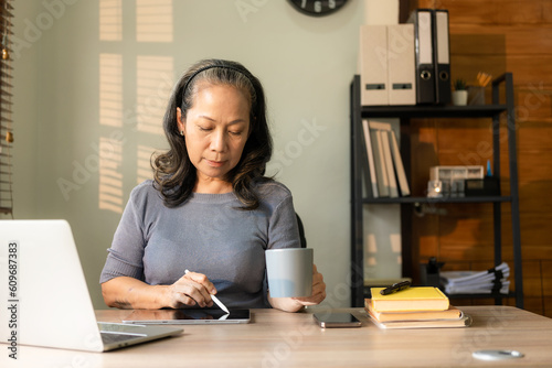 An old businesswoman in her sixties sitting at a table using a laptop. middle aged woman working at home Meet and chat online using the internet on social media.