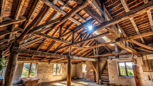 An old house with exposed wooden roof layers and visible beams, home, old house, home