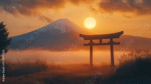 an old Japanese torii gate with Mount Fuji in the background at sunrise, misty mountains and a foggy sky