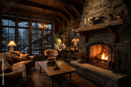 An old mountain ski lodge - rich in skiing heritage and rustic charm - offering a cozy retreat with the warmth of a fireplace - evoking feelings of winter nostalgia.