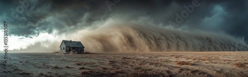 house, dust, storm, sky, field, cloud, weather, rural, abandoned, dirt, landscape, building, wind, sand, desolate, dramatic, nature, horizon, ominous, dark, atmospheric, light, texture, dry, devastation, damage, earth, outside, isolated, ruin, crumbling, structure, eerie, fear, danger, huge, powerful, scene, natural, apocalyptic, threat, environment, survival, brown, impact, wide, panorama
