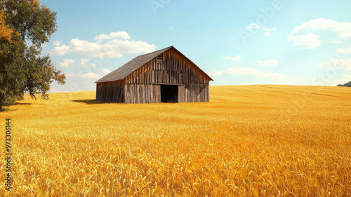 An old wooden barn stands amidst golden wheat fields under bright sky