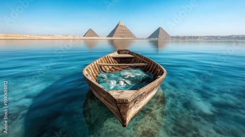 An old wooden boat floats in crystal-clear water, with a striking view of the majestic pyramids in the background under a bright blue sky, blending time and nature.