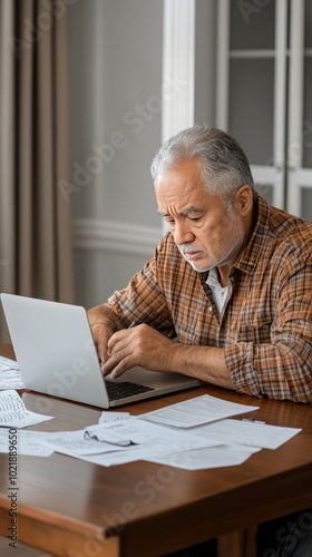 older, man, black, kitchen, table, laptop, distressed, expression, short, hair, plaid, shirt, scattered, paper, hot drink, cup, cosy, deep, thought, working, concentrating, midday, home, office, casual attire, attire, wooden, cabinet, personal, space, adult, male, focused, work, thoughtful, lunch, break, time, informal, setting, technology, struggle, paperwork, reading, writing