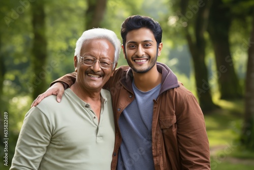 An older man and a younger man pose together for a photo in a park. A fictional character Created By Generated AI.