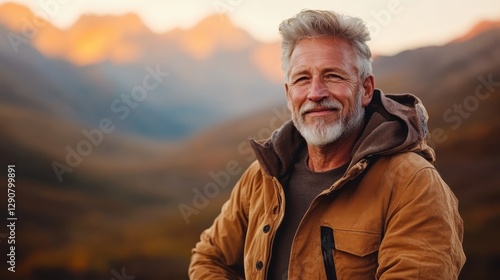 An older man with a warm smile stands confidently in a stunning natural landscape during sunset, showcasing his adventurous spirit and connection to the outdoors.
