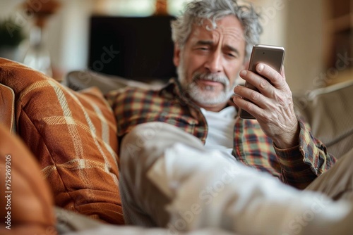 senior, technology, smartphone, man, relaxed, connection, home, comfortable, reading, communication, style, modern, casual attire, warm, comfort, leisure, sofa, plaid, interior, eyeglass, individual, expression, engagement, personal, interaction, texting, browsing, cyberspace, surfing, adult, male, concentration, sharpened, resting, sitting, indoor, couch, bokeh, background