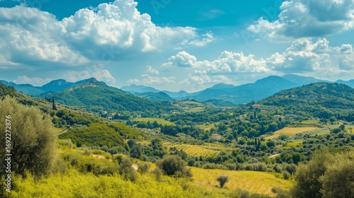 An olive grove in the mountains. A beautiful green island in the midst of lush green vistas of the island of corfu. A field of hills in summer with a shallow field depth. A mountain olive lifestyle.